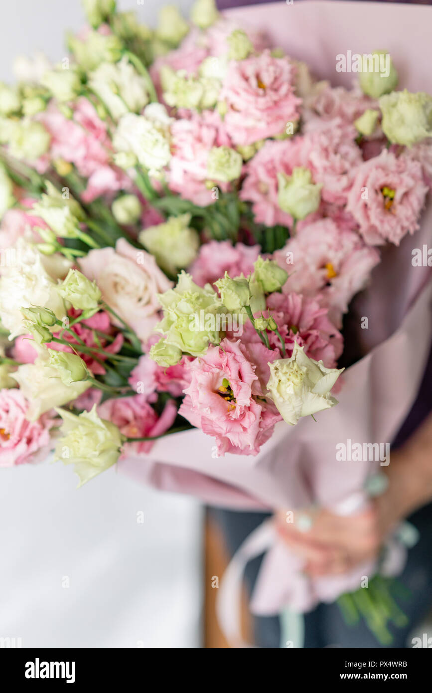 Beautiful Spring Bouquet Young Girl Holding A Flowers Arrangement With Lisianthus Of Pink Colors Stock Photo Alamy